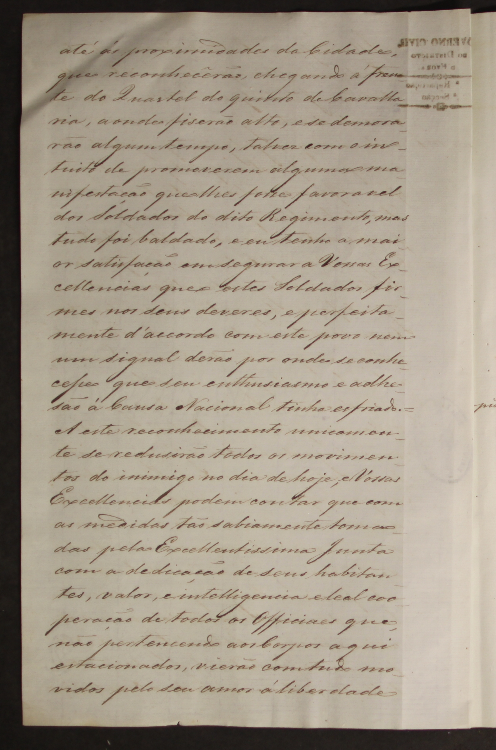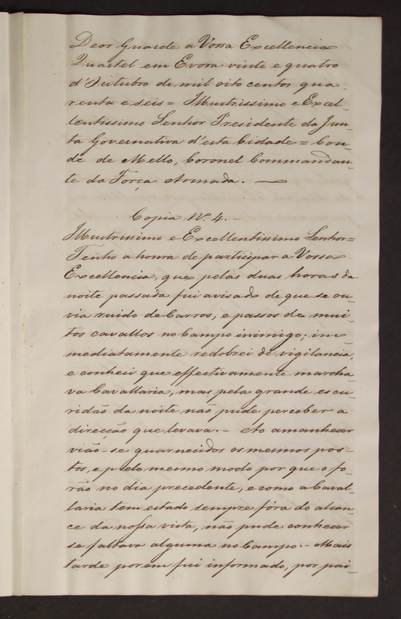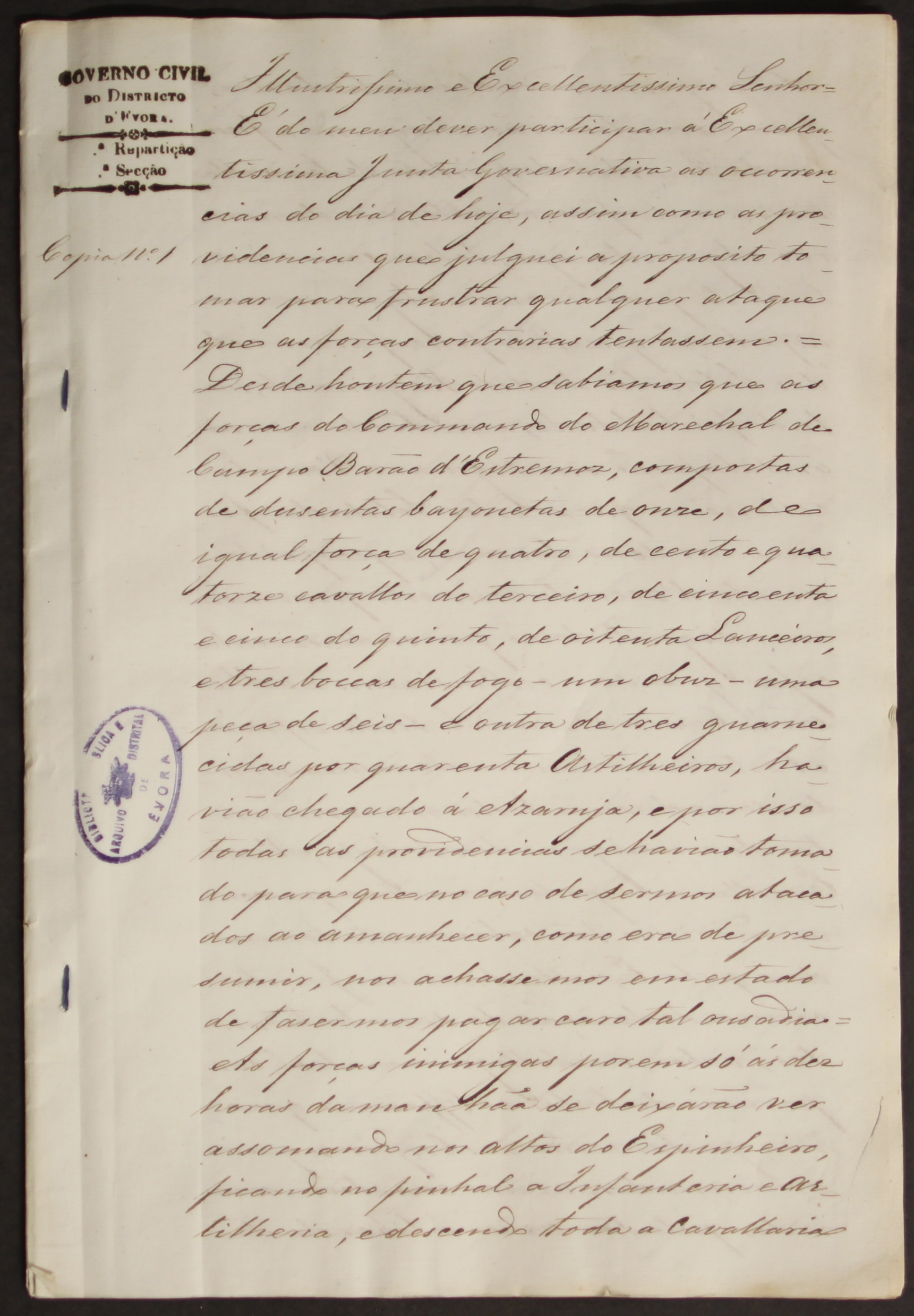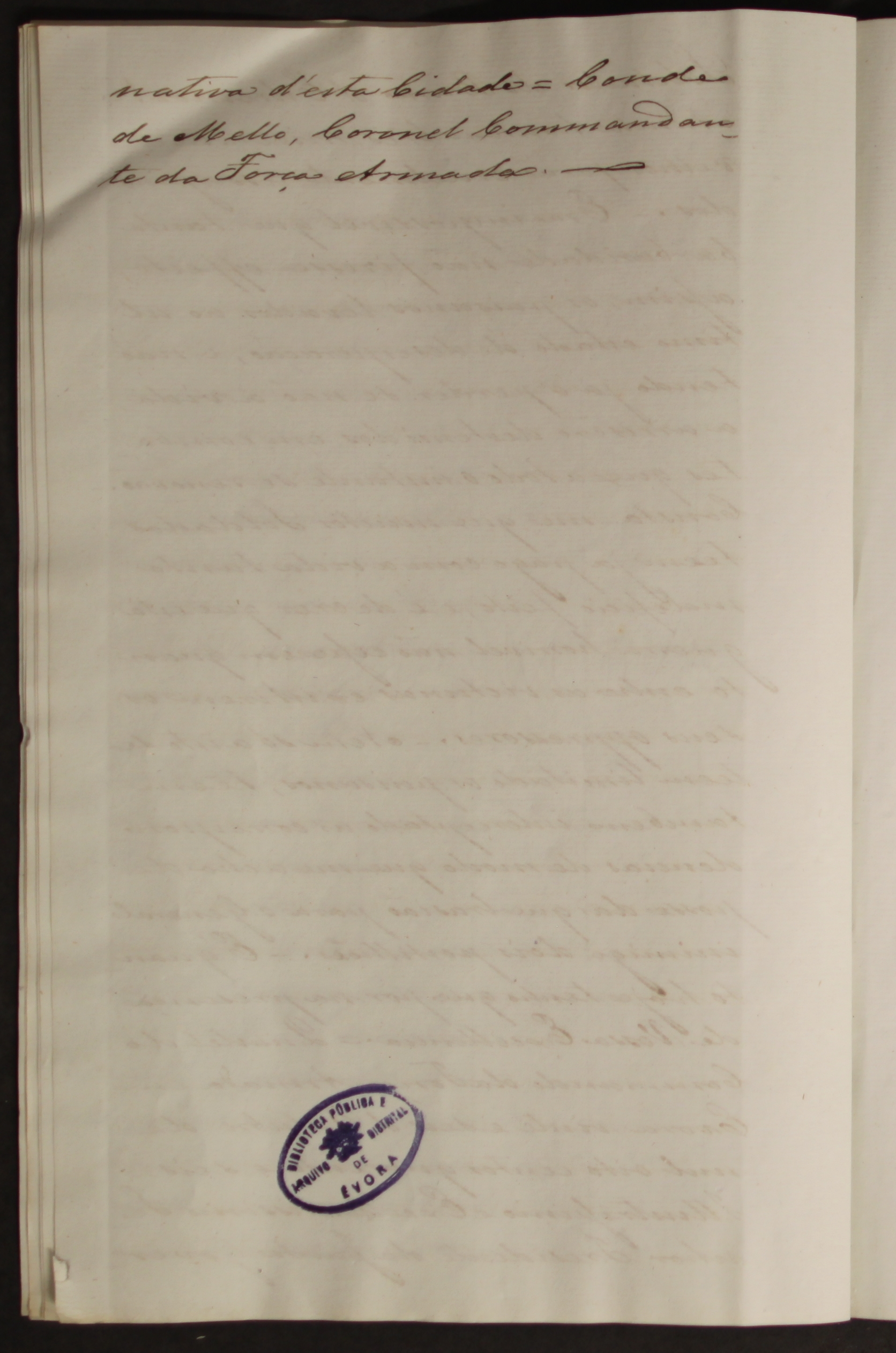 O Conde Melo, juntamente com a Guarda Nacional de Évora e alguns revolucionários, estiveram atentos e não deixaram as tropas entrar na cidade apesar de terem sido disparadas “… três granadas e nove balas de artilharia sobre a cidade…”. No documento são citados nomes de militares ou civis voluntários que estiveram ao lado do Conde Melo, como o Tenente Coronel Fernam, o Coronel Martely, o Capitão Francisconi, o Conde Avilez, o Mendonça Furtado, o Comandante Moreira, o Costa, o Sabino, o Brandeiro, o Durão, o Tenente Coronel Batalha, o Major Galamba e o Major Prego.