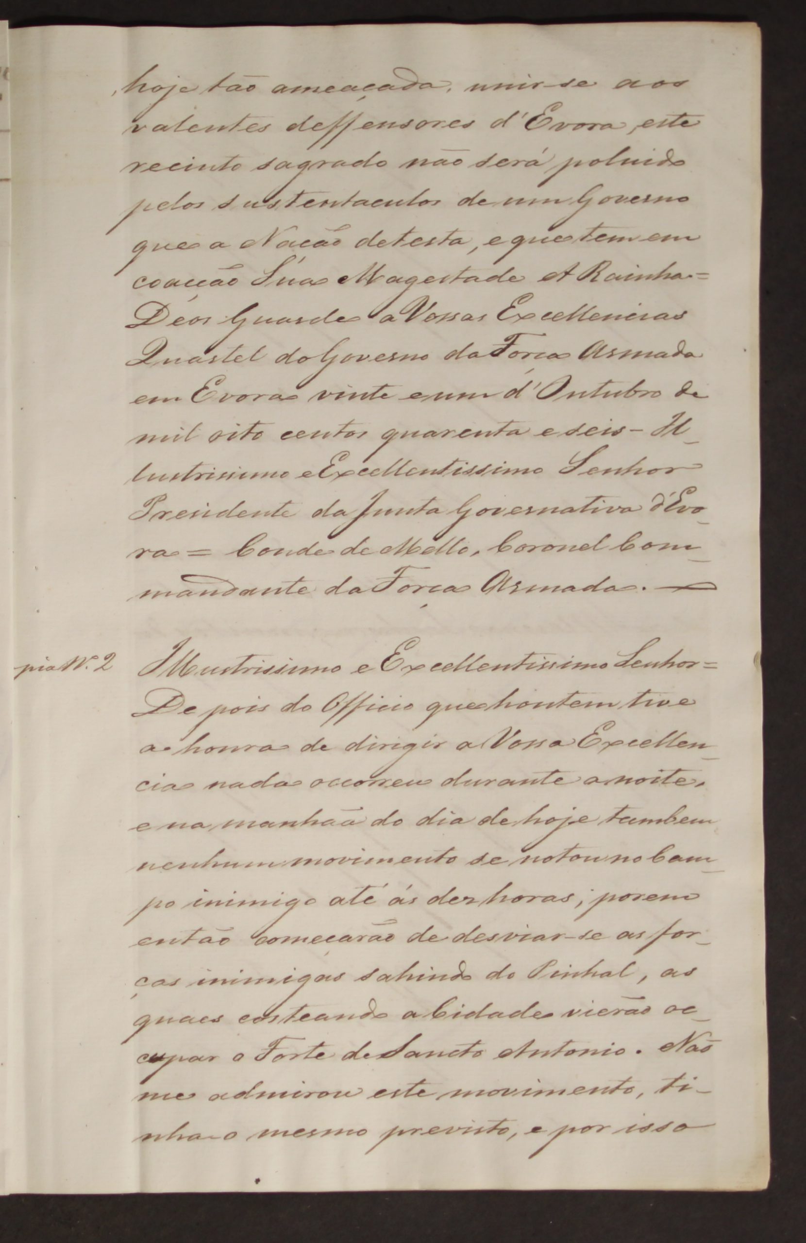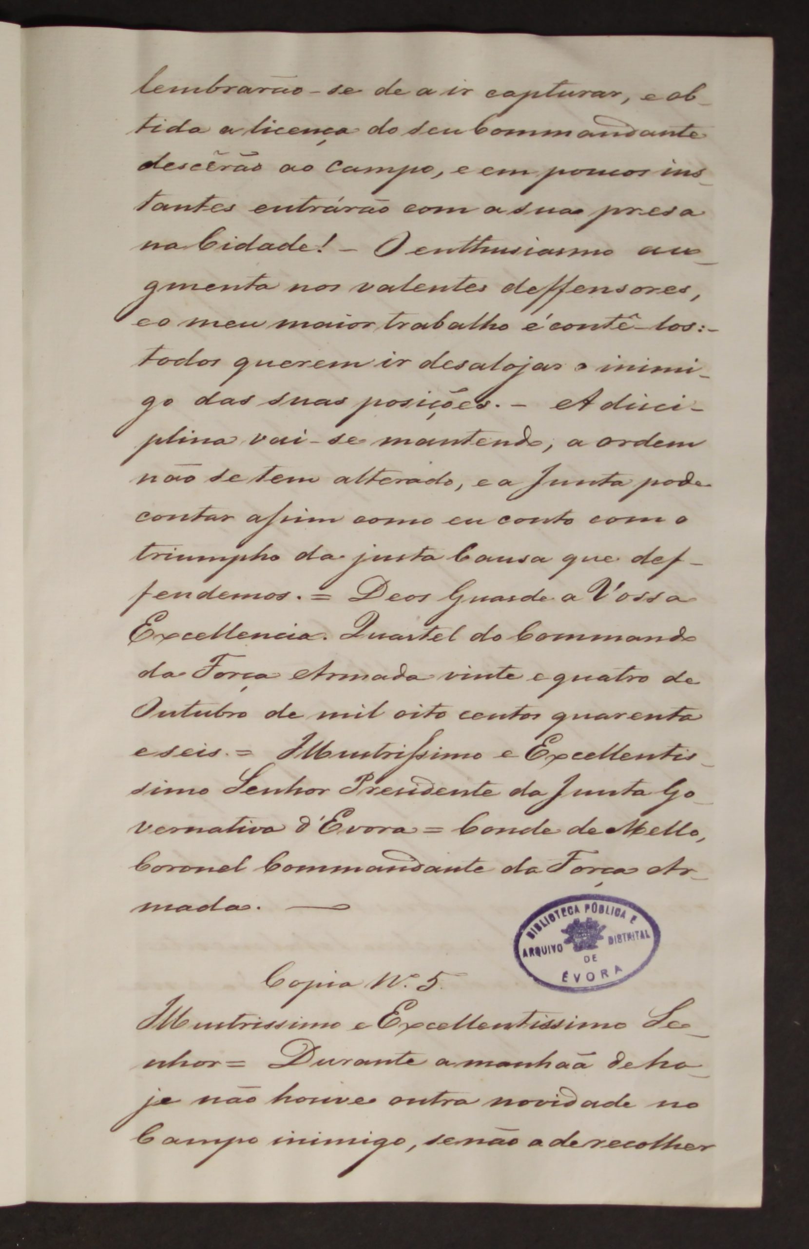 O documento que destacamos no mês de outubro estava inserido na documentação do Fundo do Governo Civil de Évora, na Secção da Assistência e Saúde Pública, e não se encontrava identificado. O documento em questão é uma cópia de cinco cartas enviadas pelo Conde de Melo, Coronel Comandante das Forças Armadas, à Junta Governativa de Évora, presidida por Inácio Fiel Gomes Ramalho, entre os dias 21 e 26 de outubro de 1846.