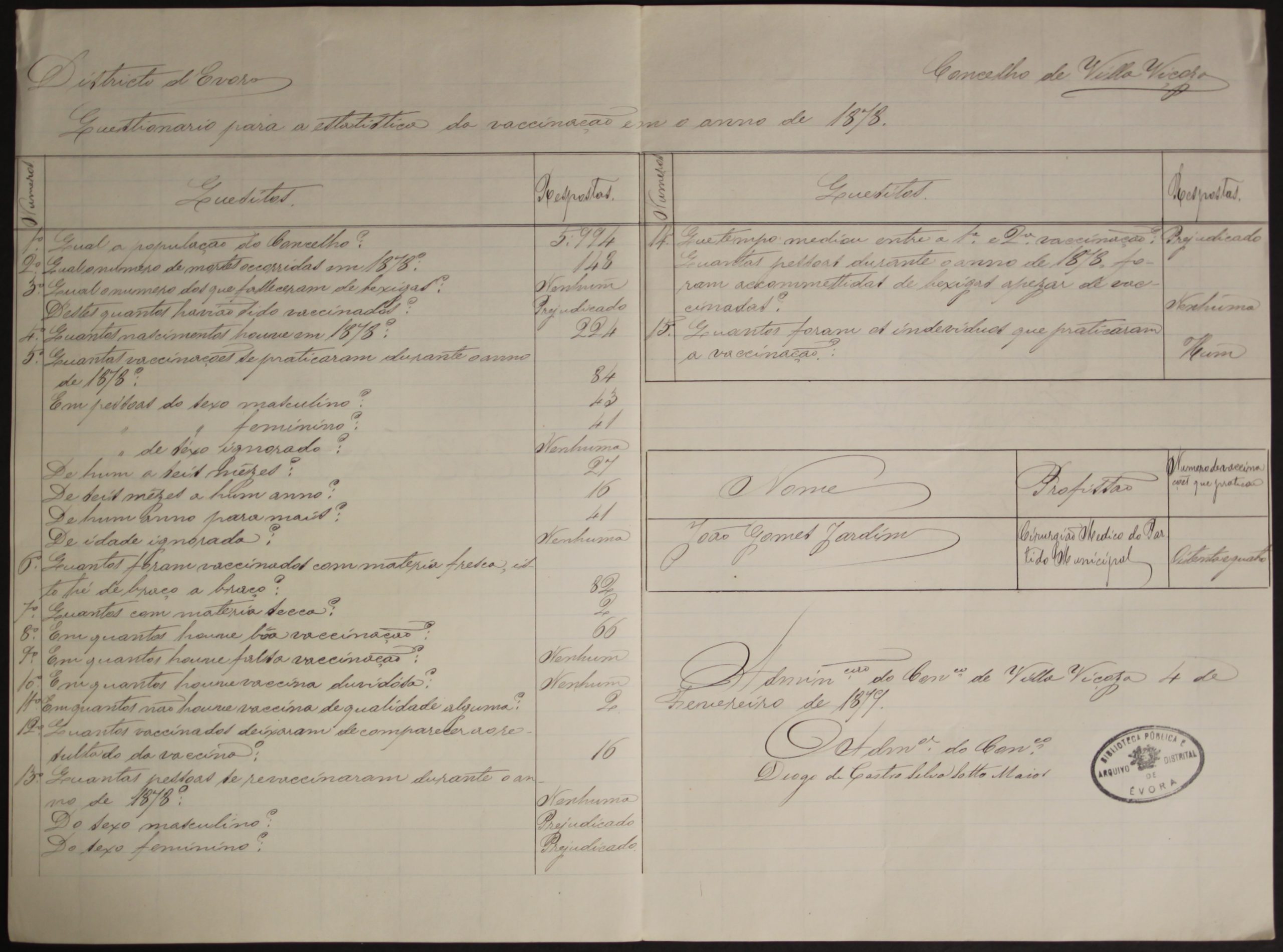 O Dr. João Gomes Jardim, médico-cirurgião do partido municipal, era o profissional de saúde responsável por vacinar a população. Entre outros dados pertinentes relativos à vacinação, no inquérito que produziu, consta o número de habitantes do concelho, o número de óbitos, o número dos que faleceram com bexigas e quantas vacinas foram administradas.