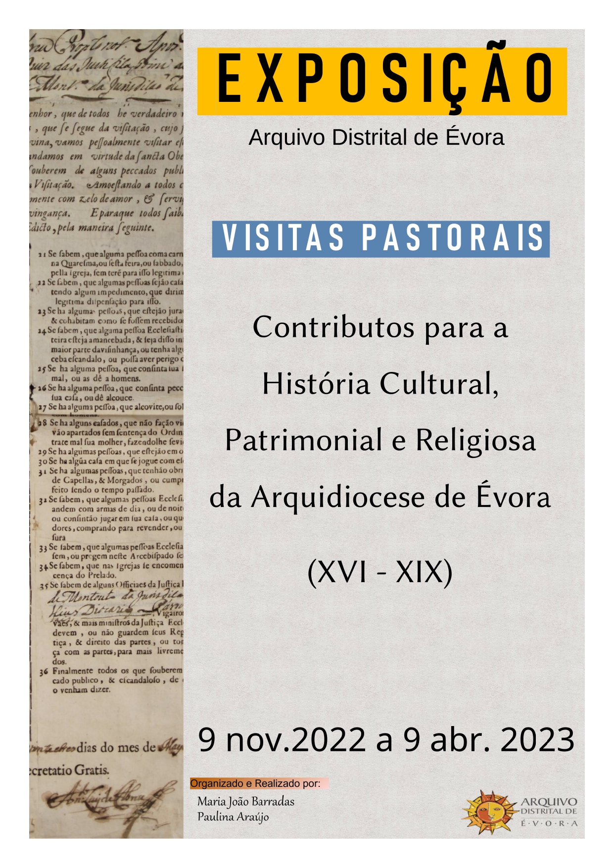 O Arquivo Distrital de Évora tem o prazer de convidar V.ª Ex.ª para a inauguração da Exposição “Visitas Pastorais: Contributos para a História Cultural, Patrimonial e Religiosa da Arquidiocese de Évora (XVI-XIX)” que terá lugar no dia 09 de novembro pelas 15 horas e 30 minutos, nas nossas instalações.