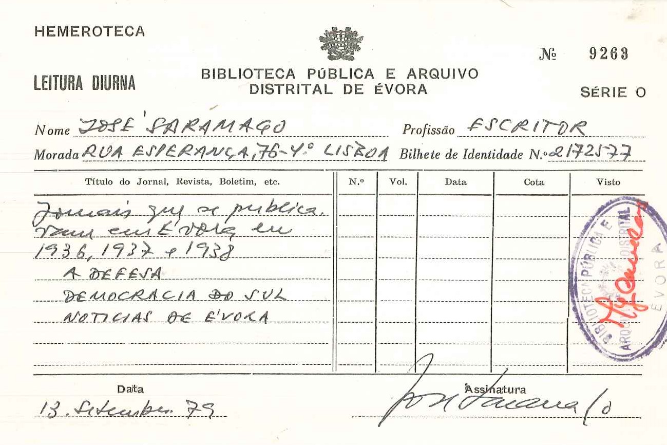 Ficha de requisição de Leitura Diurna de José Saramago, do dia 13 de setembro de 1979, requisição de periódicos locais.