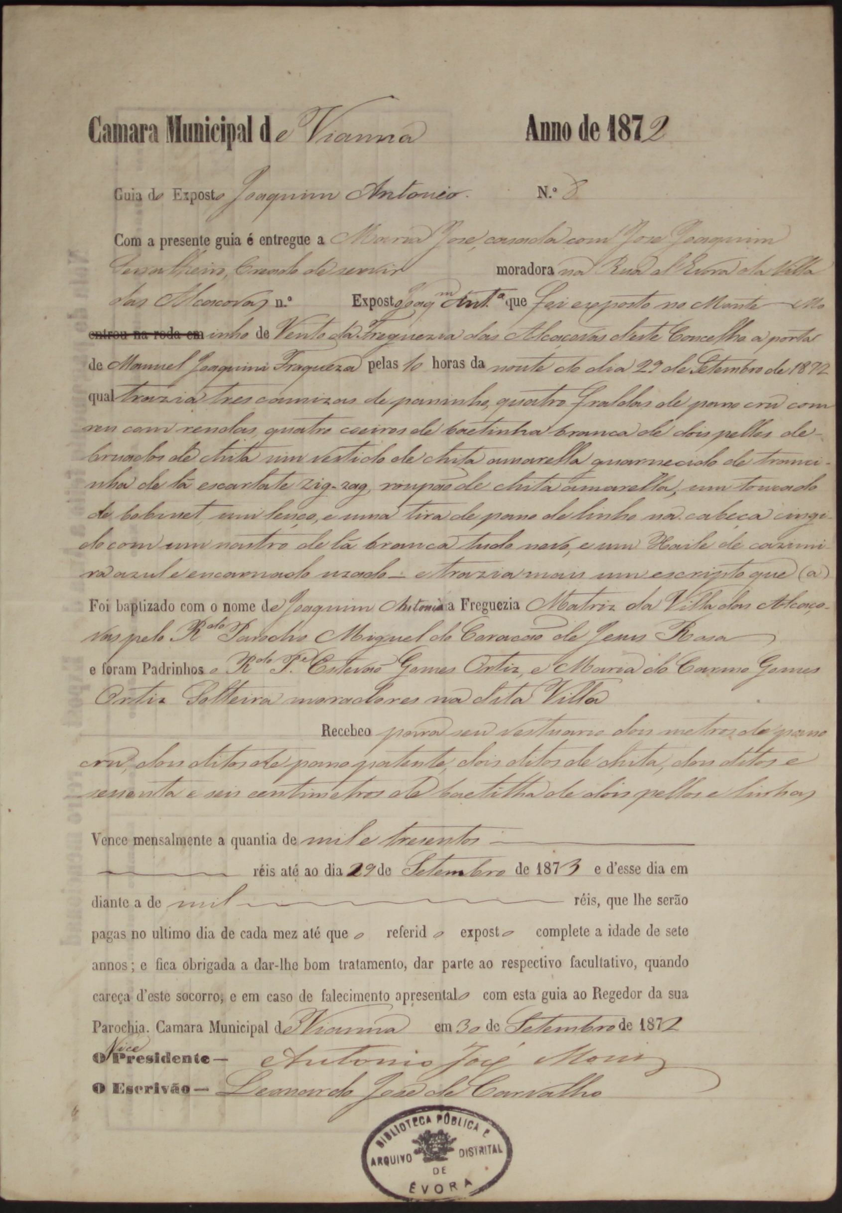 O menino foi entregue à ama Maria José, casada com José Joaquim Serralheiro, criado de servir, moradores na vila das Alcáçovas, na Rua de Évora, que receberia mensalmente o salário de 1300 réis, bem como tecidos e linhas para a confeção de vestuário para o mesmo, ficando obrigada “a dar-lhe bom tratamento” e a levá-lo ao médico sempre que “careça d’este socorro”, até que completasse 7 anos. No caso de falecer a criança teria de dar conhecimento ao Regedor da sua Paróquia e entregar-lhe a Guia do mesmo.