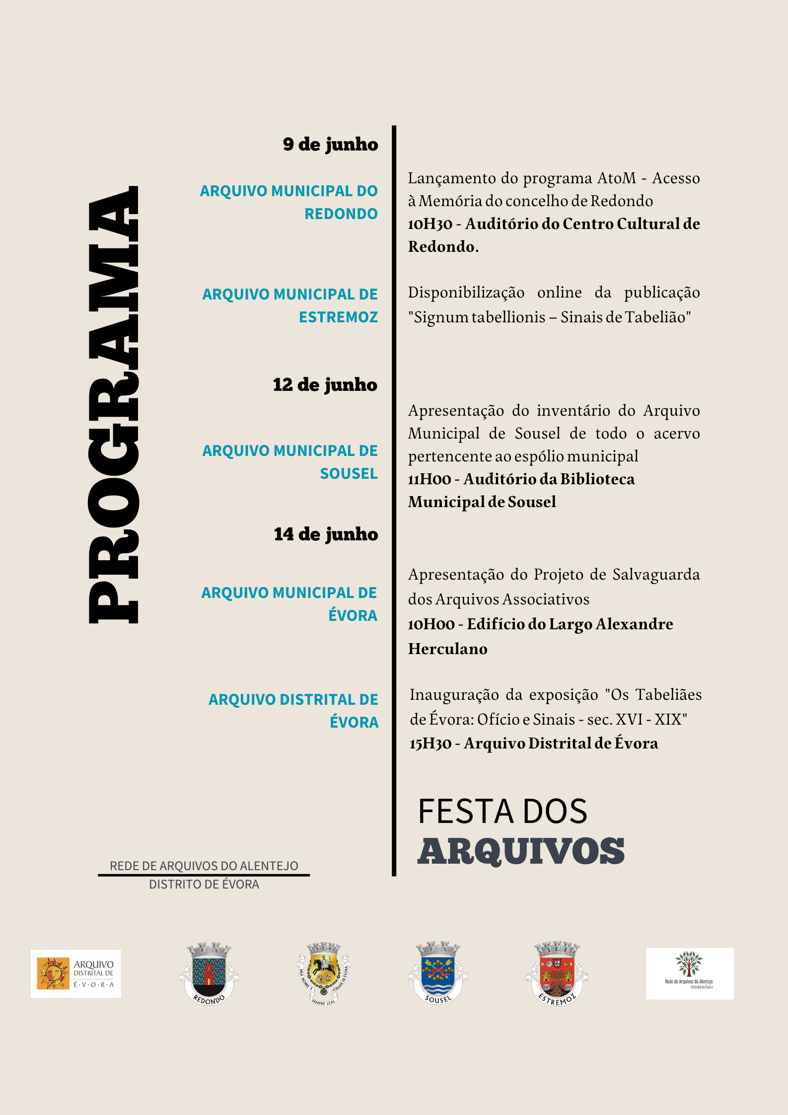 A Rede de Arquivos do Distrito de Évora, para assinalar o Dia Internacional dos Arquivos (9 de junho), organiza este ano mais uma edição da “Festa dos Arquivos”, que agrupa as iniciativas de vários membros que integram a Rede ou grupos de trabalho da mesma.