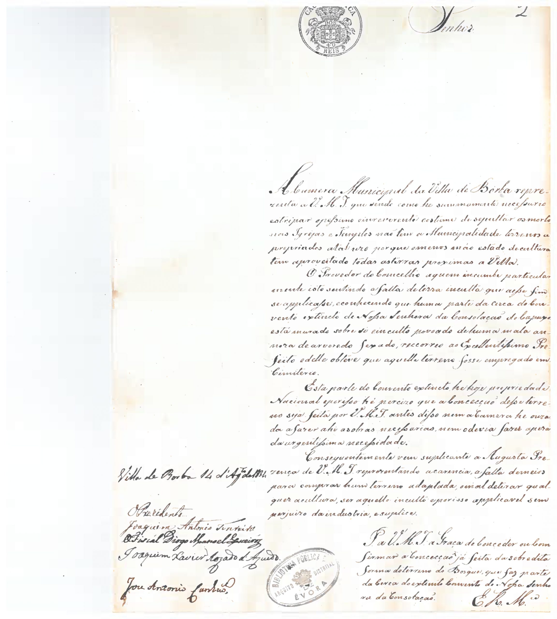 O Arquivo Distrital de Évora divulga como documento do mês de agosto um pedido da Câmara Municipal da Vila de Borba dirigido ao Prefeito da Província do Alentejo, datado de 14 de agosto de 1834, sobre a confirmação da concessão do bosque do extinto Convento da Nossa Senhora da Consolação, para ali se instalar um cemitério, pois é necessário terminar com a prática de sepultar os mortos nas igrejas e templos.