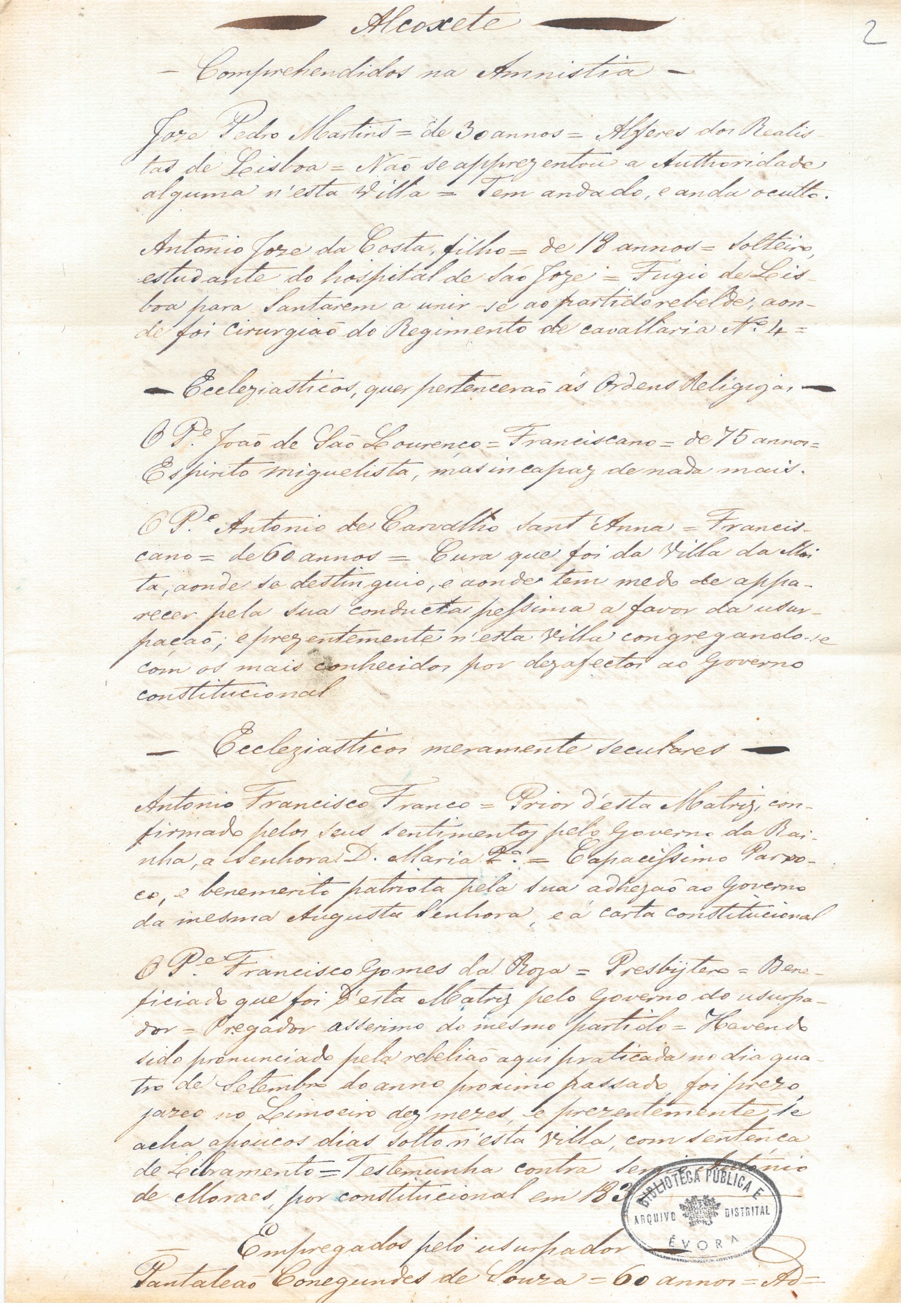Assim, neste mês de setembro, o Arquivo Distrital de Évora divulga um documento datado de 25 de setembro de 1834, escrito pelo Provedor de Alcochete, António Joaquim Leitão, no qual consta a lista de pessoas compreendidas na Amnistia.