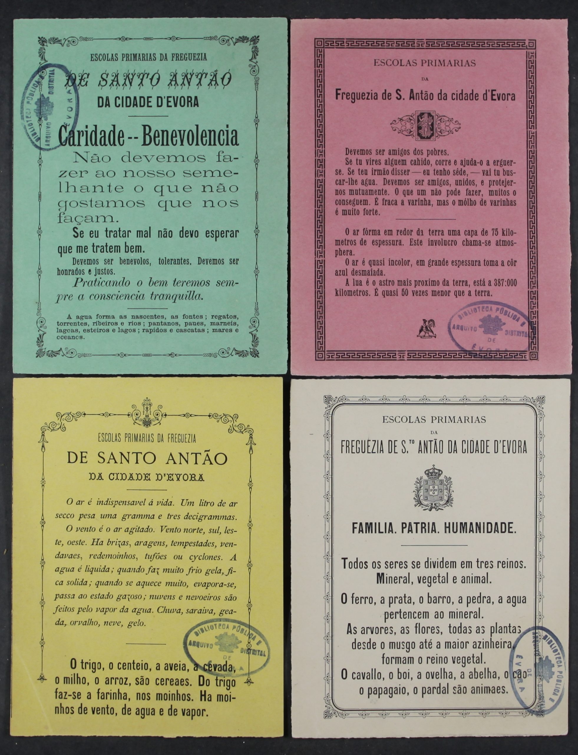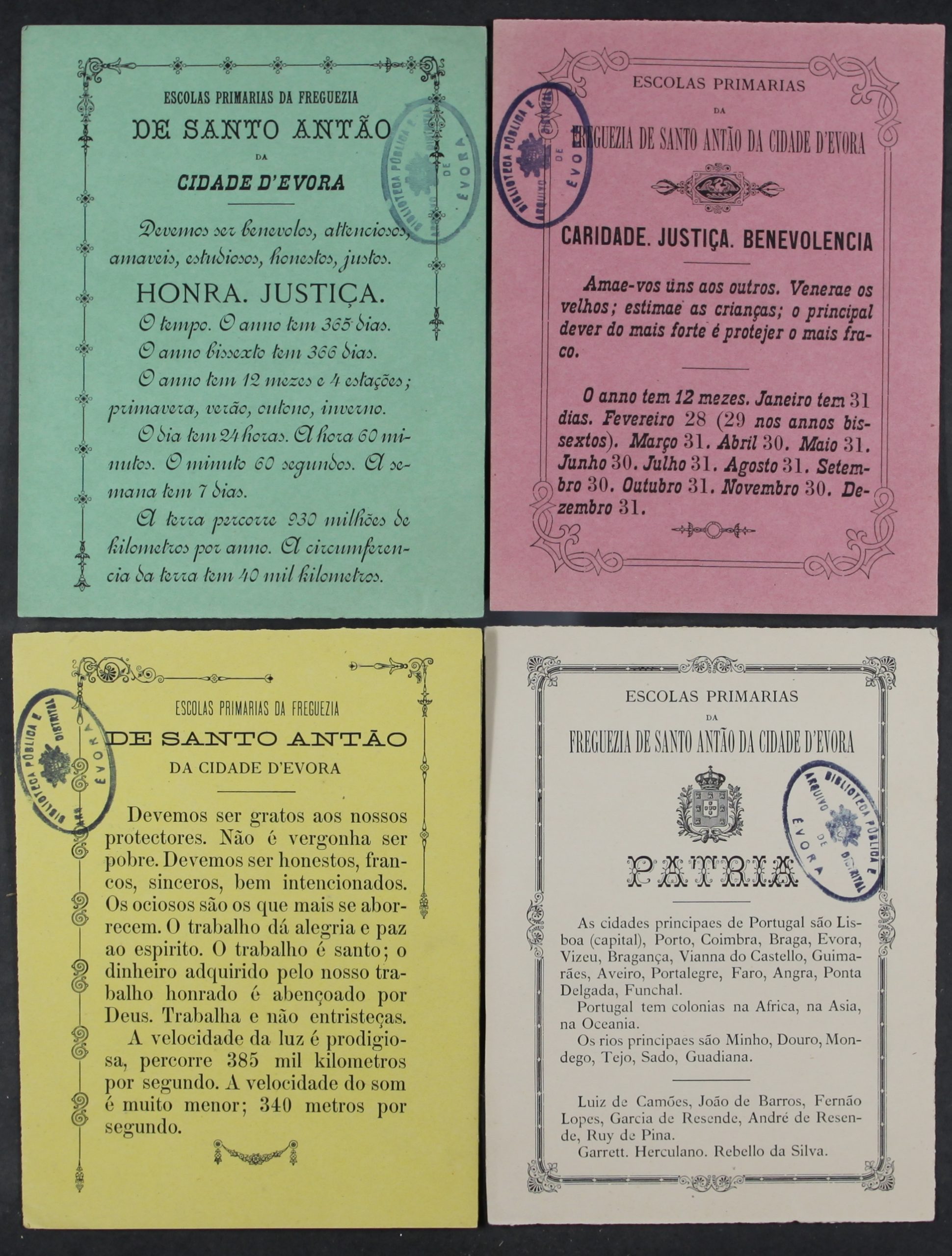 Os documentos que destacamos no mês de janeiro são os materiais de apoio com conteúdos das disciplinas de Educação/Civilidade, Moral, Religião, História e Geografia, ensinadas nas Escolas Primárias da freguesia de Santo Antão da cidade de Évora. As mesmas não se encontram datadas nem fazem referência à tipografia em que foram impressas, o que torna difícil identificar o período em que serviram nas aulas. Presumimos que sejam do séc. XIX, tendo em conta os conteúdos das mesmas e o design das cercaduras das fichas muito utilizadas pelas tipografias da época.