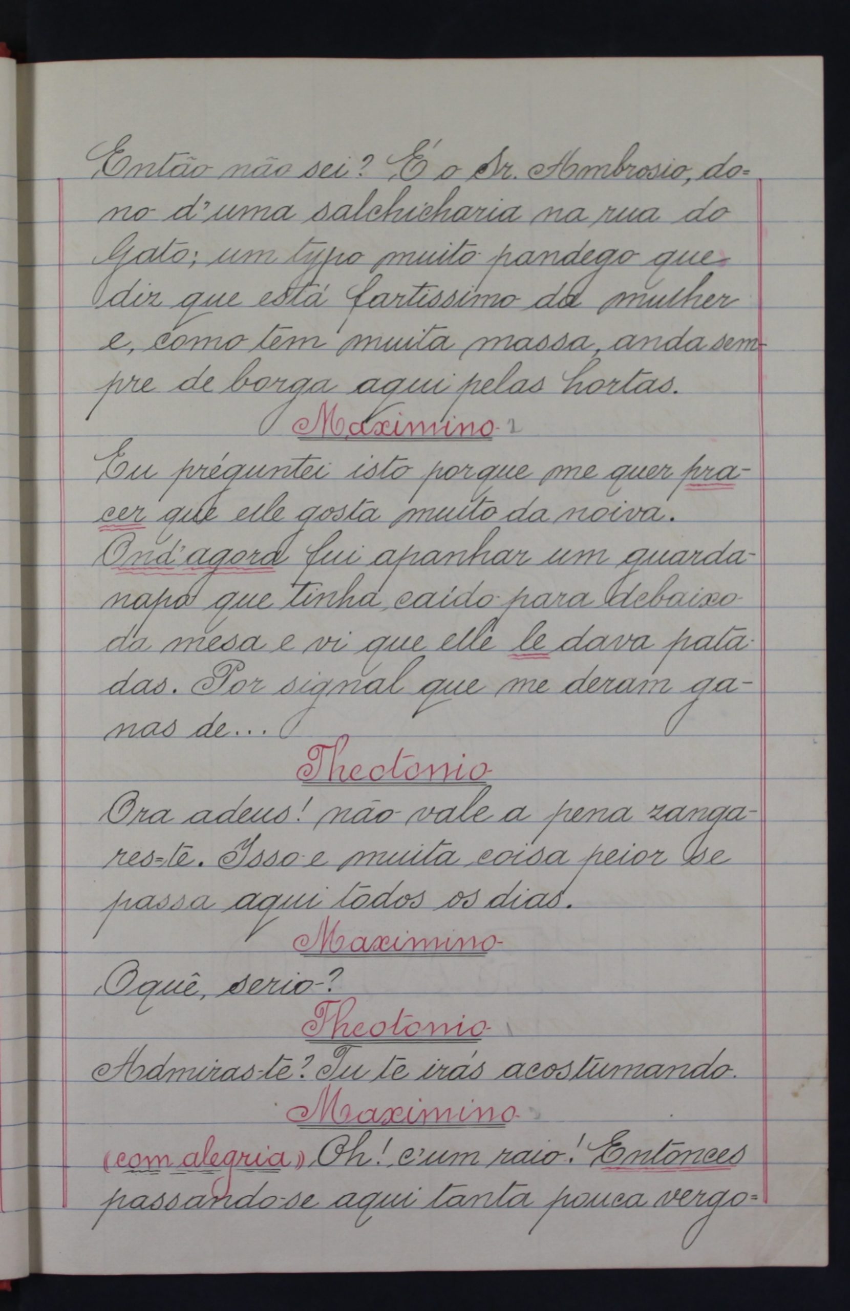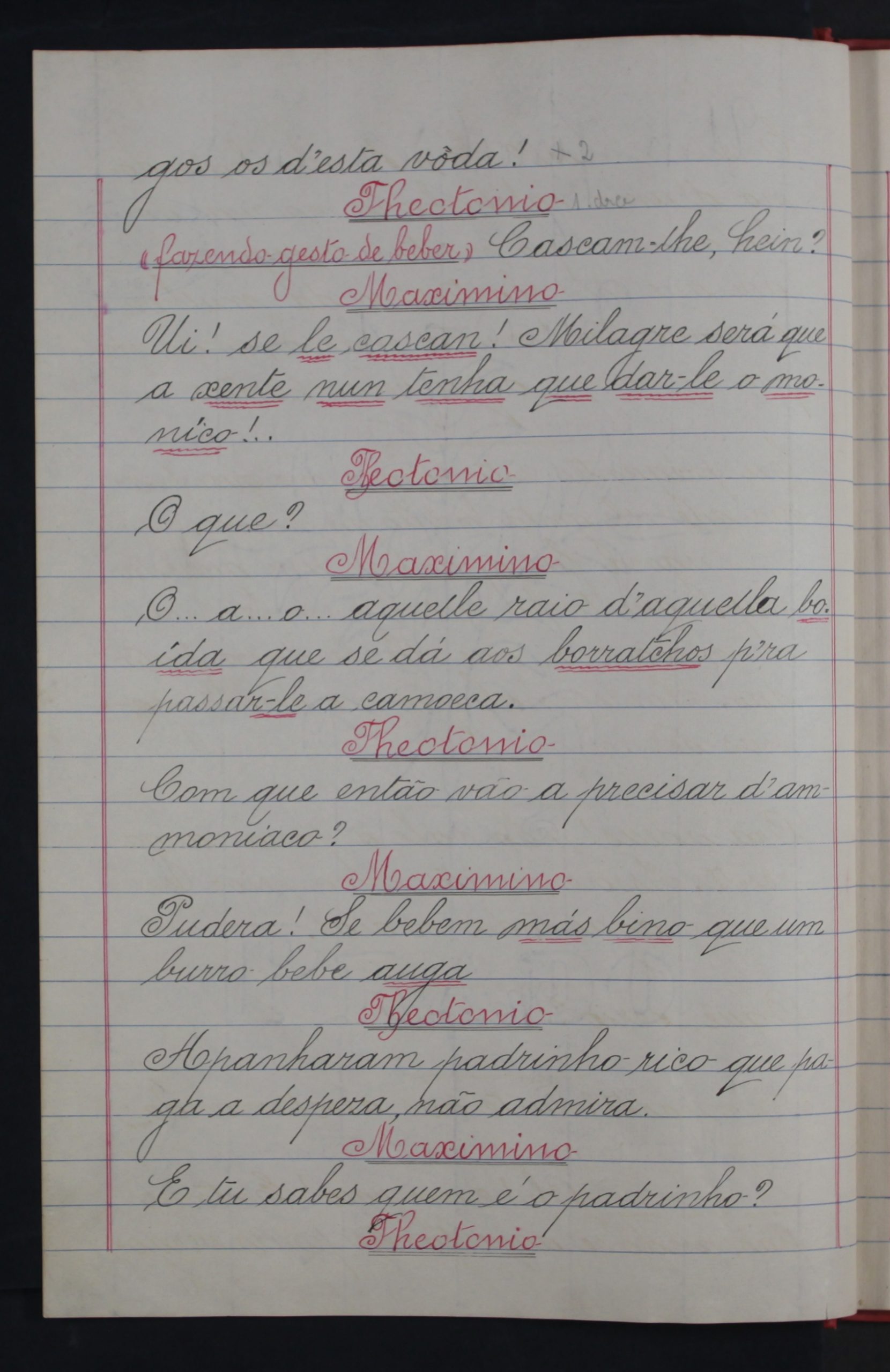 Entre os personagens principais consta o Martinho, clarinetista da banda da festa, que recebe dinheiro de Dom Ambrósio para enganar o noivo e afastá-lo da boda para o padrinho se aproveitar da noiva (entregando-lhe um bilhete de uma suposta ex-namorada para se encontrar com ele, ameaçando ir à festa armar escândalo). Quando o noivo sai da festa o padrinho leva a noiva a casa, mas a rapariga, percebendo as suas intenções, não o deixa entrar na habitação. Entretanto, Dona Teresa vai no alcance dos dois, acompanhada pelo músico do clarinete, preparada para dar uma lição ao marido. A peça acaba na habitação dos noivos entre grande sarrabulho, quando o clarinetista acaba por levar um banho com um jarro de água que a noiva lhe atira da janela pensando tratar-se do padrinho, e, ao sair da habitação, esquecendo-se do clarinete, volta atrás e leva uma sova da Dona Teresa que pensa tratar-se do marido. Ao chegar, enfim, Dom Teodósio também é recebido pela mulher, que o insulta e lhe bate freneticamente. Quem não percebe o que se está a passar é o noivo quando regressa a casa e a quem todos dizem que se tratava de uma brincadeira do padrinho. No final, é o músico Martinho que, apesar da molha e da tareia, mais lucra com a confusão, ao extorquir dinheiro ao noivo e ao padrinho: ao primeiro para não contar à noiva o motivo por que saíra da festa e, ao segundo, exigindo ser pago por ter afastado o noivo da festa e pela sova que Dona Teresa lhe dera, exigindo notas verdadeiras, porque o padrinho tentara enganá-lo da primeira vez pagando-lhe com dinheiro falso.