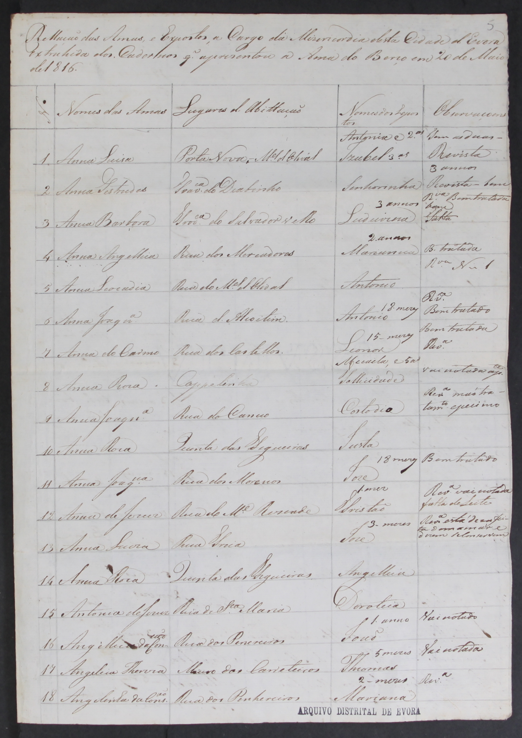 Averiguação das condições dos expostos da cidade de Évora em maio de 1816