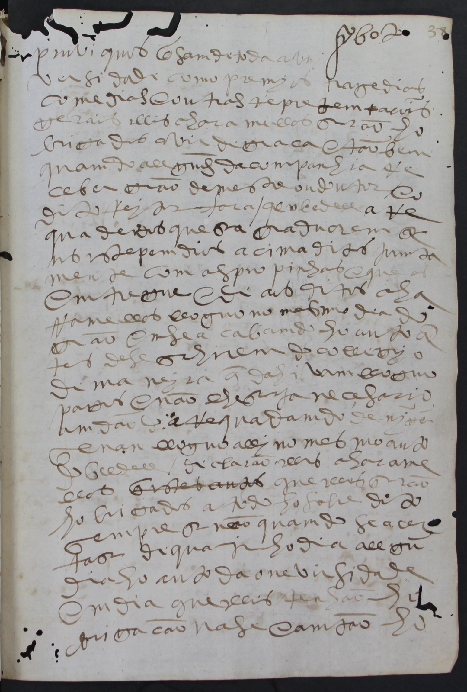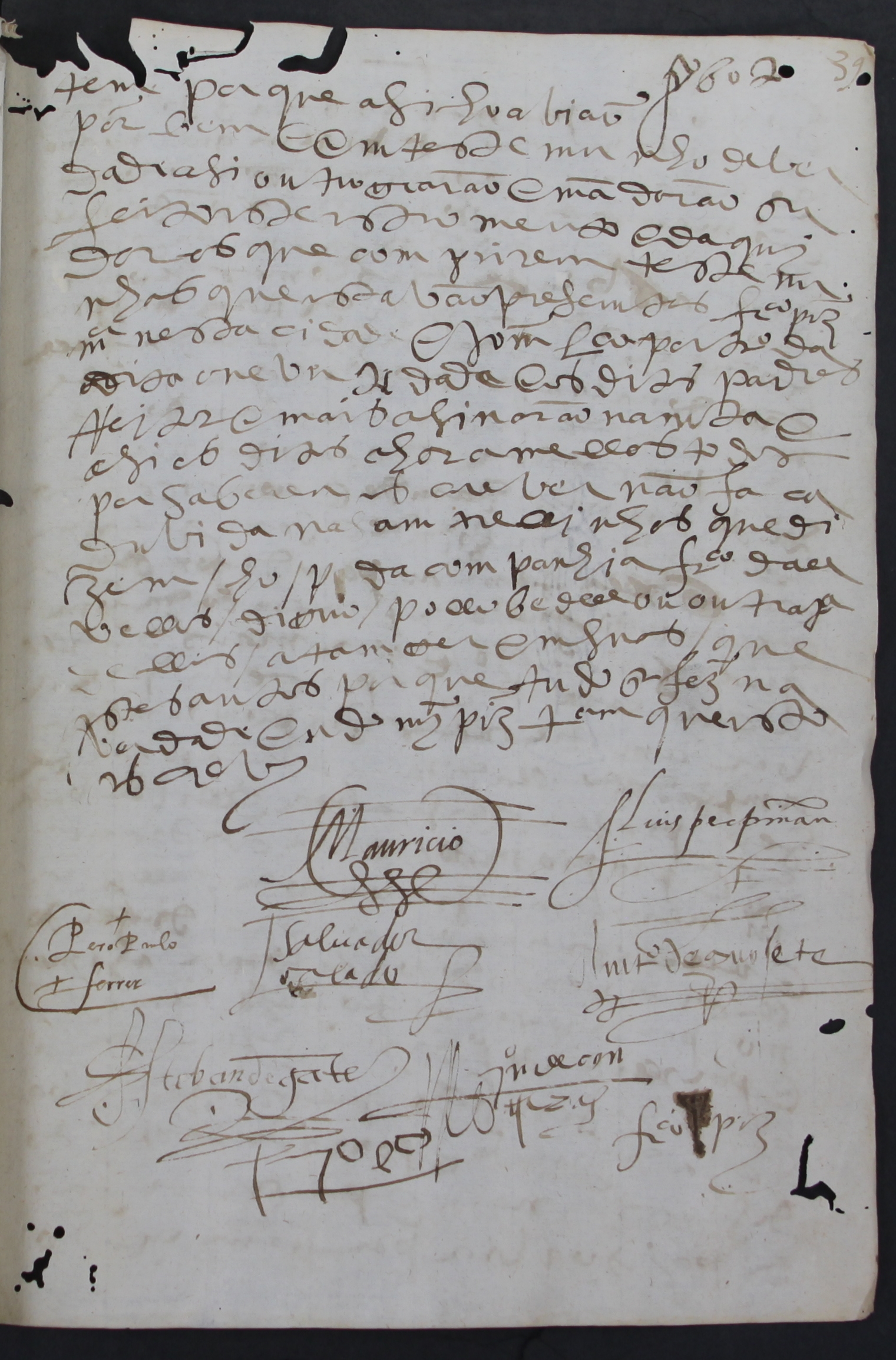 [f. 36] Saibam quamtos este instrumento de concerto/ e obrigação virem/ que no ano do nacimento de noso senhor [f. 36vº] jesus cristo de mil e quinhentos/ e sesenta e oito anos aos deza/nove dias do mes de outubro em/ esta cidade de evora no collejo/ da companhia de jasu na casa do/ despacho delle estamdo ahi/ jumtos para satisfazerem ho/ caso seguinte hos muito vertuoso/ senhores padres comvem a saber ho/ padre mauricio vicio reitor e o padre/ doutor pero paullo fereira camcelario da/ mesma uneversidade e o padre luis [p pi/nhão] todos da companhia irmãos na dita casa lloguo/ por elles foi dito que elles estavão ho/ra comcertados com os charamellas/ desta cidade comvem a saber com amto/nio gollete e francisco de allvellos e estevão/ da gante e joam de comtreiras/ estão ahi presentes lloguo por eles foi di/to que em seu nome e dos mais se/us companheiros francisco gollete e sallvador/ callado que presente estava foi di/to que elles se hobrigavam a servir/ esta casa da uneversidade de evora/ da maneira seguimte que eles/ serão hobrigados a [o hir sempre] [f. 37] todos ou pollo menos qua/tro delles que facam prefeita mu/siqua a todos ho grao seguinte por/ esta ordem convem a saber em/ ho grau dos bachareis e llecenciados/ as besporas e misa e a dos do grao do/ dito dia da misa tamgemdo todas/ as vezes que forem necesarias e/ llevarão por estepemdio para quada/ grau destes dous mill reis// e em/ grao de mestre lhe darão por este/pemdio mill e duzentos reis e se/ tomarem ho grao dous jumtos se/ lhe darão dous mill reis e se forem/ três hos que se agarduarem de mes/tre se lhe darão dous mill e oitocen/tos reis e quamdo se agarduar all/gum de doutor em teuoligia a/llem das todas sobreditas hobrigações serão hobrigados a/ companhar ho novo doutor das/ escollas ate igreja nova deste/ collejio tamgemdo todas as vezes/ que comprir e terao de estepem/dio deste grao de doutor mill/ e seiscemtos reis e se acomtecer/ allgum ora que se facam dous jumtos [f. 37vº] doutores teram por estependio/ dous mill e quatrocemtos reis e isto/ se não for allgum deles da com/panhia como abaixo se dira e/ em todos estes graos sera obri/gado ho dito reitor a mandar/ avisar pollo bedell outra pessoa dous dias amtes a amtonio/ gollete ou a qualquer de seus com/panheiros que elle nomear e sem/do elle somente avisado tera avisa/do de fazer com que elle e os mais/ seus companheiros acudam a/ seu tempo e serão mais hobri/gados ao estedantes em todos os/ graos a tamgerem em alguns llu/gares pruvicos pollo menos a por/ta das escollas em tereiro da se/ e no grao de doutor de doutor e/ mestre a porta dos que/ se ouverem de agraduar alem/ dos ditos llugares pruvicos/ e asi mais/ serão hobrigados de virem sempre/ quatro pollo menos e não vindo all/gum destes quatro se lhes mullta/ra pro rata ho que couber ha quada/ hum delles que he a quarta parte/ do estepemdio/ e asi mais em os autos [f. 38] pruviquos que sam de toda a uni/versidade como premios tragedias/ comedias e outras represemtaçõis/ gerais elles charamellas serão ho/brigados a vir de graca e tãobem/ quando allguns da companhia re/ceber grao de mestre ou doutor e o/ dito reitor fara/ que o bedell are/quade dos que se agraduarem se/us estepemdios acima ditos junta/mente com as propinhas e que os/ entregue e de aos ditos cha/ramellas lloguo no mesmo dia do/ grao em se acabamdo ho auto an/tes de se sahirem do collegio/ de maneira que dahi vam lloguo/ pagos e não lhe seja necesario/ amdando arequadamdo de ninguem senan llogo alli no mesmo auto/ do beedell/ declarão elles charame/llas que elles serão/ hobrigados a todo ho sobredito/ sempre senão quamdo se acer/tase de [quair] ho dia allgum/ dia ho auto da onevirsidade/ em dia que elles tenhão ho/brigação na se e amtao ho/ reitor tera cuidado de/ fazer com que se desemcom/tre estas hobrigaçõis/ e asi/ mais as que se ouverem de agar/duar serão hobrigados a/ não trazerem outros chara/mellas aos sobreditos autos/ e se os troixerem nem por iso/ deixem de lhe ficar hobriga/dos a pagar ho dito estepemdio/ por emteiro como esta decla/rado/ e lloguo pollo padre reitor/ e mais padres que estão presentes/ foi dito que elles se hofereciam a/ favorecellos o ditos charame/llas em todas as cousas que/ lhe comprirem desta honever/sidade como a pesoas que a ser/vem e asi emcomendaram ao/ meirinho e allmotacee que os/ conheca e faca como os estu/damtes na feira e çouge/e asi/ ho outrogarão e mandarão de/llo ser feito este estromento/ de comtrato ho quall porme/terão e se hobrigarão de com/prir em todo como se nelle con/ [f. 39] tem porque asi ho avião/ por bem e em testemunho de ver/dade asi outrograrão e mandarão ser/ feito este estromento e daqui/ dar os que comprirem testemu/nhas que estavao presemtes Francisco Pirez/ morador nesta cidade e João Lourenço, porteiro da/ dita oneversidade e os ditos padres/ reitor e mais asinarão na nota e/ asi os ditos charamellas todos/ por saberem escrever não faca/ duvida nas amtrellinhas que di/zem /ho/ p da companhia francisco de all/velos/diguo/ pollo bedell ou outra testenhunha/ delles/ a tamger em suas/que/ estes autos porque tudo se fez na/ verdade eu domingos pirez tabeliam que isto escrevi