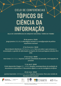 O Ciclo de Conferências Tópicos em Ciência da Informação resulta de uma parceria do Arquivo Nacional Torre do Tombo – Direção-Geral do Livro, dos Arquivos e das Bibliotecas e do Centro de Estudos Clássicos da Faculdade de Letras da Universidade de Lisboa com o objetivo de promover a apresentação e a discussão de temas de investigação em Ciência da Informação