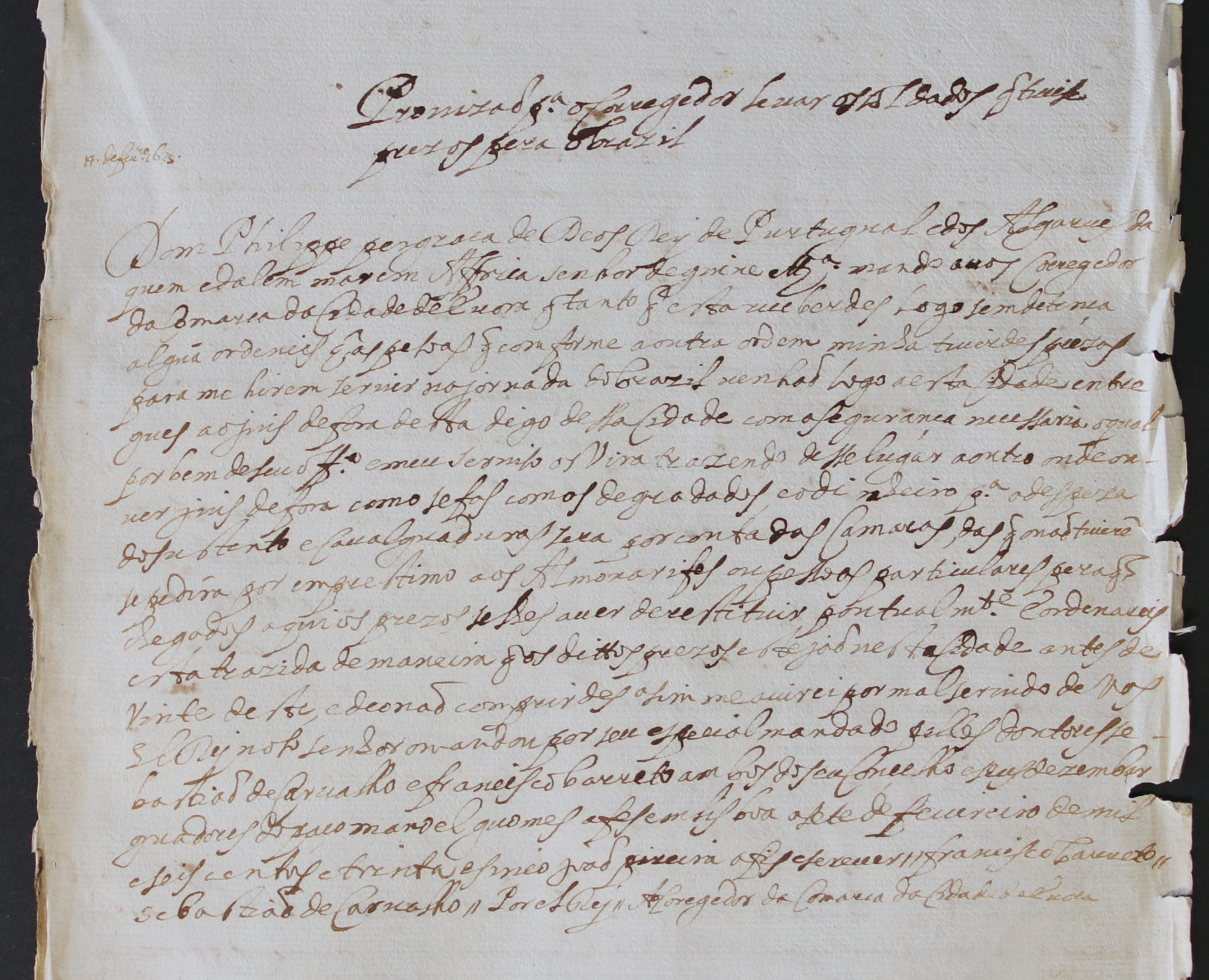 O documento do mês de janeiro é uma provisão de D. Filipe III, de 7 de fevereiro de 1635, para o Corregedor da Comarca de Évora, mandando que este enviasse para Lisboa, antes de 20 de fevereiro de 1635, as pessoas que se encontrassem presas para “…irem servir na jornada do Brasil… “, as mesmas deviam ser entregues ao Juiz de Fora da cidade de Lisboa, sendo a despesa da segurança e transporte dos presos suportada pelas Câmaras da Comarca, se as mesmas não tivessem dinheiro pediriam empréstimos aos Almoxarifes ou a pessoas particulares. A provisão está relacionada com o assunto de uma provisão anterior, de 12 de janeiro de 1635, em que o monarca manda que se junte “gente” para servir na armada e que os soldados já alistados que se ausentassem sem licença fossem presos e enviados juntamente com os novos recrutados para serem enviados para o Brasil.